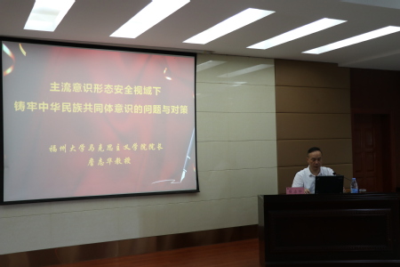 福州大学马克思主义学院院长詹志华教授作了题为《主流意识形态安全视域下铸牢中华民族共同体意识的问题与对策》的讲座。