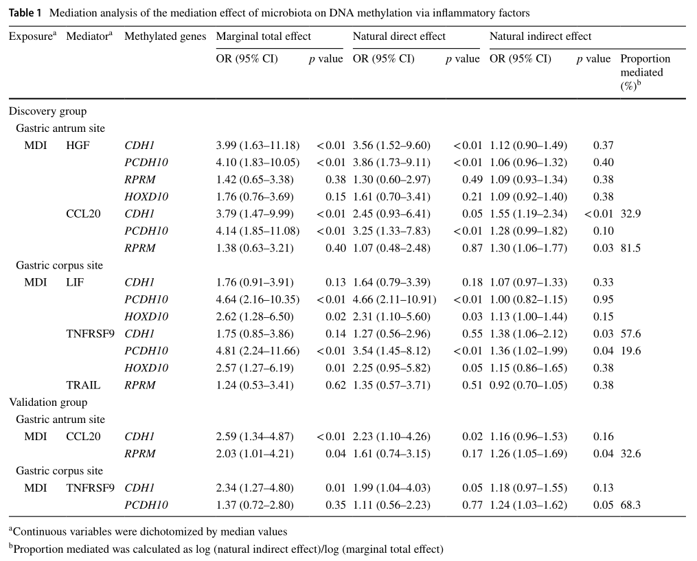 接下来,该文作者选择了与MDI相关的蛋白质和与炎症标志物相关的甲基化基因进行中介分析。发现胃窦中炎症蛋白CCL20在MDI与CDH1甲基化的关联间具有显著的中介作用,胃体中炎症蛋白TNFRSF9在MDI与CDH1和PCDH10甲基化间具有中介作用。之后,作者在验证组中证实了CCL20 (OR, 1.26, 95% CI 1.05-1.69,proportion mediated = 32.6%)和TNFRSF9 (OR, 1.24, 95% CI 1.03-1.62,proportion mediated = 68.3%) 在胃菌群失调与DNA甲基化改变之间的关联中发挥显著的中介作用(表1)。
