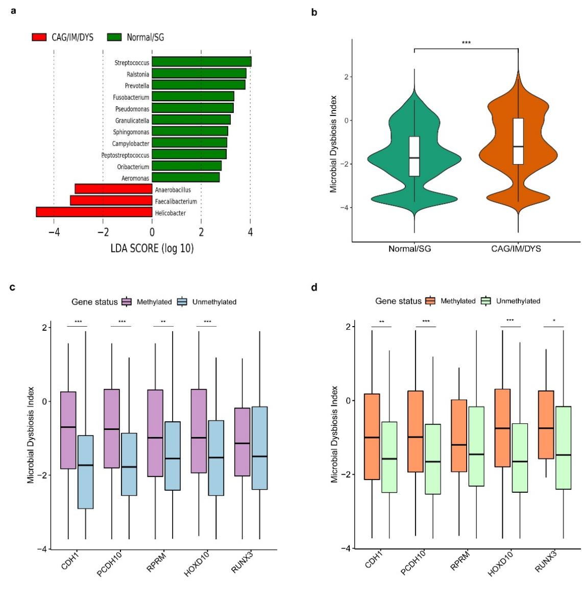 测序结果分析显示在属水平上,对照组有11个优势类群,而包括螺杆菌属在内的3个属在PLGC组中显著富集(图1a)。此外,PLGC组的菌群失调指数(microbial dysbiosesis index , MDI)水平明显高于对照组(图1b)。该文作者随后比较了9个特定相关基因的甲基化状态,发现基因CDH1、PCDH10、RPRM、HOXD10和RUNX3的甲基化频率升高与PLGC风险增加显著相关。另外,胃窦中CDH1、PCDH10、RPRM或HOXD10发生甲基化的个体与未发生甲基化的个体相比MDI值显著升高(图1c)。胃体中CDH1、PCDH10、HOXD10或RUNX3发生甲基化的个体的MDI值高于未发生甲基化的个体(图1d),表明胃菌群失调与特定基因甲基化改变相关。