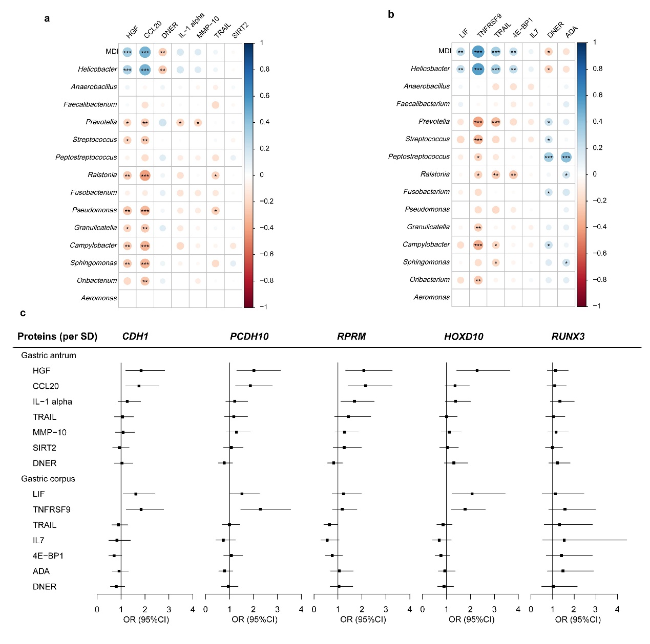 在46个被纳入分析的炎症蛋白中,该文作者采用LASSO回归分析,在发现组的胃窦和胃体组织样本中分别筛选出7个炎症生物标志物。使用Spearman相关性分析估计筛选出的炎症生物标志物与差异菌属的丰度以及MDI指数之间的关联(图2a和2b)。图2c提供了炎症生物标志物水平每增加1个标准差(SD)导致的5个差异基因发生甲基化的相对风险的估计值。