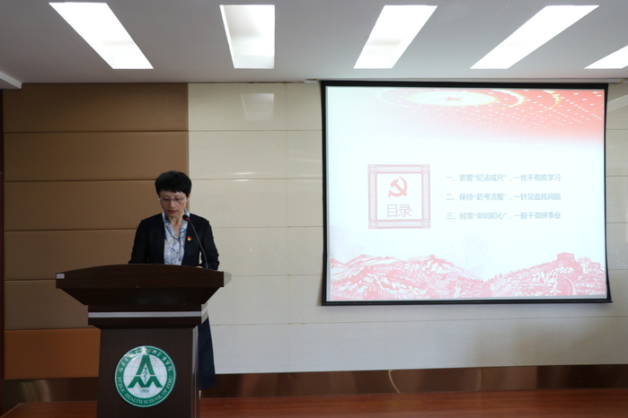 林玉芝以《学习贯彻<中国共产党纪律处分条例> 以党风廉政建设成效提升干事创业实绩》为主题,从“紧握‘纪法戒尺’,一丝不苟抓学习”“保持‘赶考清醒’,一针见血找问题”,“时常‘叩问初心’,一股干劲拼事业”三个方面展开,为师生阐述了修订后《条例》的具体内容,高度概括了本次修订的特点,结合不同层面、不同领域、不同类型的典型案例深刻剖析了《条例》所明确的违反六大纪律的行为,警醒师生党员千万不要把制度当成“稻草人”,千万不要把责任当成“耳边风”,千万不要把纪法和规矩当成“纸老虎”。
