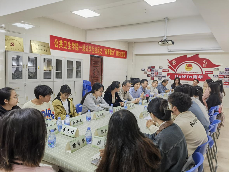 紧接着,赖颖茜老师就学院的专业情况、课程体系、就业情况等相关信息进行了分享和交流。期间,陈汐同学与屠鲁景同学分享了自己入学以来在学习生活上的感受和问题。马克思主义学院院长陈燕萍书记仔细聆听并强调:“在学习过程中,我们必须重视理论与实践的紧密结合,将课堂所学知识在实习与实践期间有效应用,不断积累实战经验,提升解决实际问题的能力。同时,还要时刻保持对公共卫生领域最新政策动态的洞察,积极拓展学术视野,紧跟时代步伐。”
