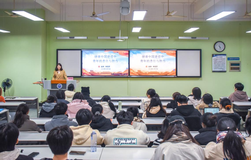 2024年12月19日,学院党委书记林玉芝老师于亚洲中文精品乱码上街校区第3教室开展了一场以“健康中国建设中青年的责任与担当”为主题的思政课,学生党建中心青年读书社100余名社员参加。