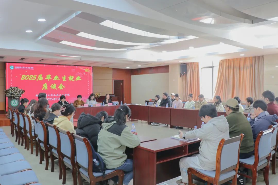 为深入了解我院2025届毕业生的就业意向和需求,进一步提升毕业生就业服务质量,公共卫生学院于1月6日在公卫楼319学术报告厅召开2025届毕业生就业座谈会。学院党委副书记王小丽、党政办主任余胜男、学工办主任赖颖茜、教学科研办副主任杨素铧、毕业班辅导员及20名毕业生代表参加座谈。