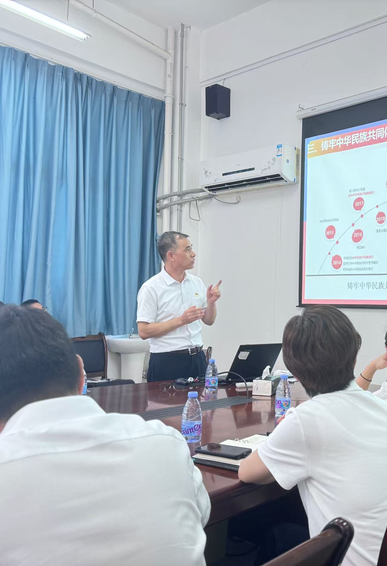 统战部党支部刘国有书记以《铸牢中华民族共同体意识,培养堪当民族复兴重任的时代新人》为题上党课,通过历史溯源、理论阐释与实践案例相结合的方式,让在场的党员干部深刻认识到铸牢中华民族共同体意识是新时代党的民族工作的“纲”,只有铸牢这一意识,才能增进各民族对中华民族的自觉认同,推动中华民族成为认同度更高、凝聚力更强的命运共同体。