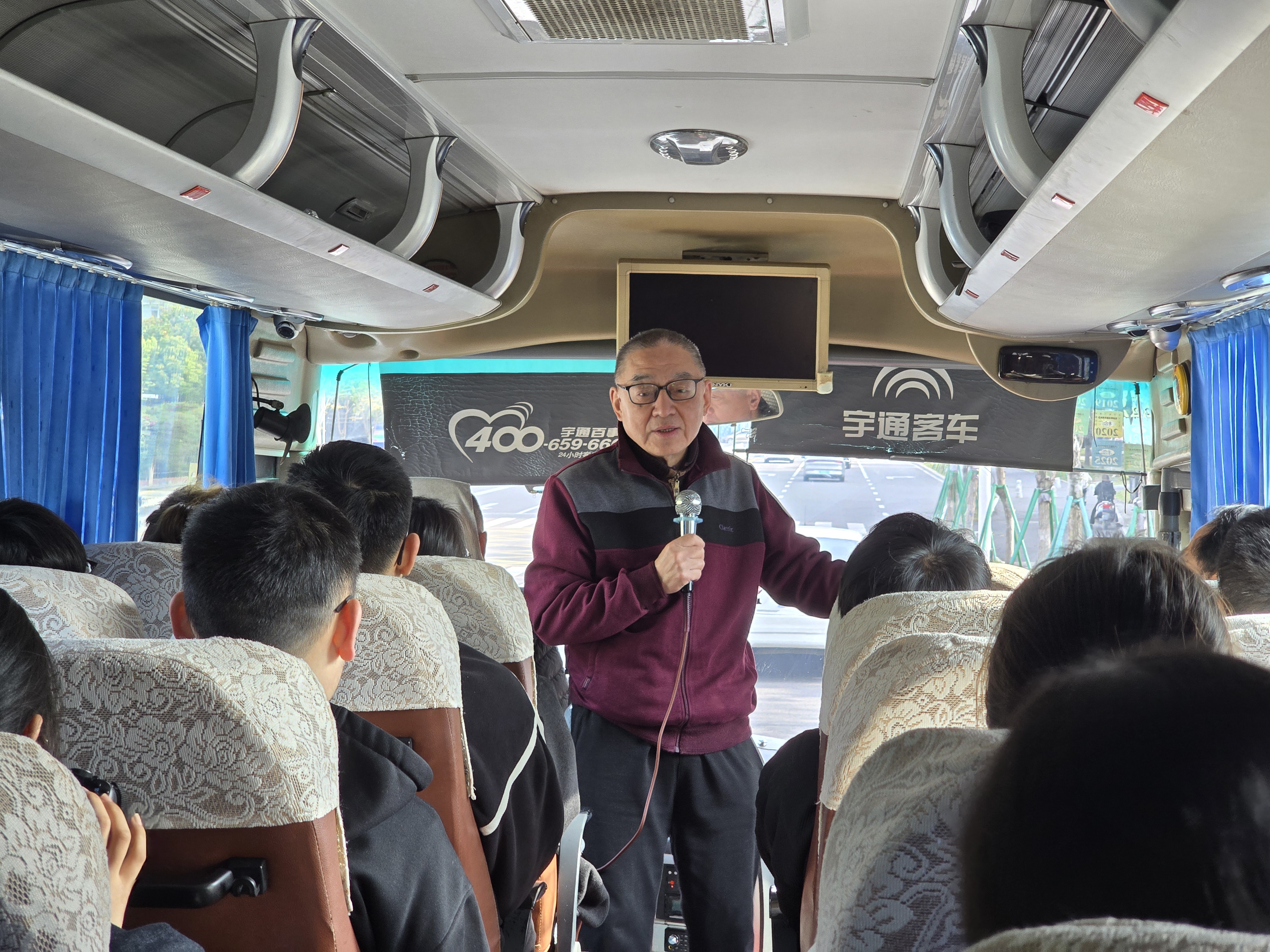 在开往烈士陵园的大巴车上,唐明生和李元芳两位老党员为同学们深情讲述了革命先辈为福建和福州的解放与建设事业浴血奋斗的英勇故事。