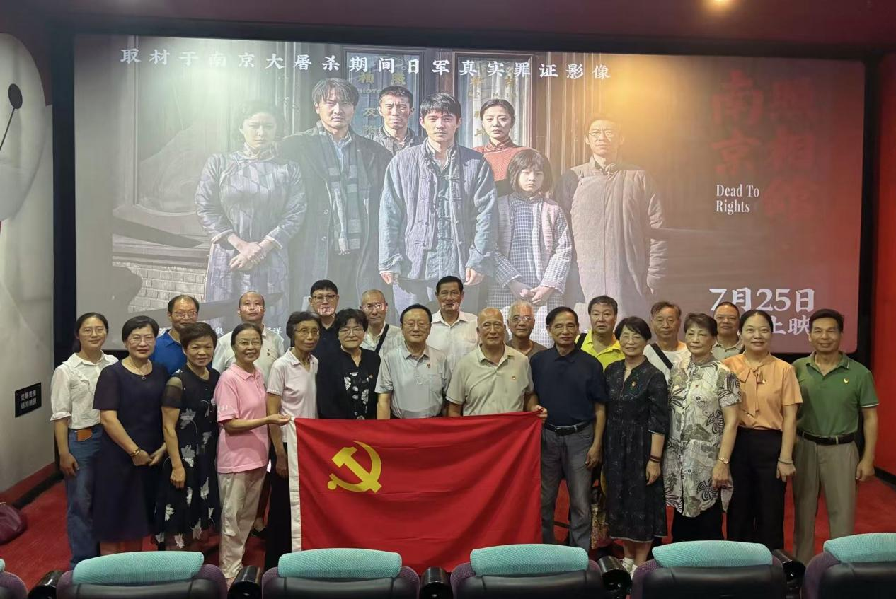 参观结束后,党务骨干们集体观看抗战题材电影《南京照相馆》。影片以南京大屠杀为历史背景,通过一家照相馆的命运变迁,展现了普通民众在战争中的苦难与抗争,刻画了无数平凡人在绝境中坚守良知、奋起反抗的英勇形象。随着剧情的推进,银幕上日军的残暴行径让观影的老同志们神情凝重,而影片中民众们的顽强抵抗又让大家心生敬意。当看到电影主人公们冒着生命危险保护同胞、记录历史真相时,不少党员同志悄悄擦拭眼角的泪水。
