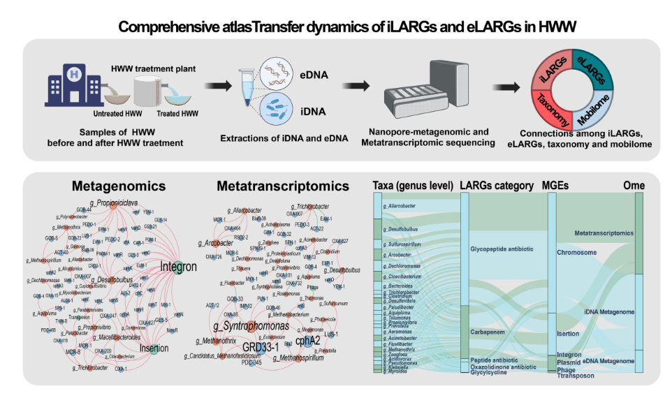 李彬团队通过不断改良用于细胞外DNA提取的CTAB法,突破现有实验技术瓶颈,成功将该新技术应用于研究。在实验技术创新基础上,本项目联合采用长读长宏基因组学和宏转录组学揭示医院废水HWW中LARGs多样性和转录活性,尝试明确该类耐药基因在医院废水中的分布、表达、传播等重要特点。