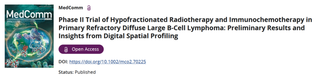 Yang Y, Yu J, Hu X-M, et al. Phase ⅡTrial of Hypofractionated Radiotherapy and Immunochemotherapy in Primary Refractory Diffuse Large B-cell Lymphoma: Preliminary Results and Insights from Digital Spatial Profiling. DOI:https://doi.org/10.1002/mco2.70225