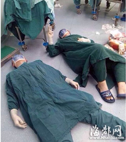 昨日,在微博上疯传的照片的说明称,协和医院的陈靖、陈松两名外科医生,躺在手术室的地板上,累得动弹不得,陈松医生给出了胜利的手势,表示手术成功。图片提示,手术时间是“2014年6月21日早上9点到2014年6月22日下午5点”,历时32小时。